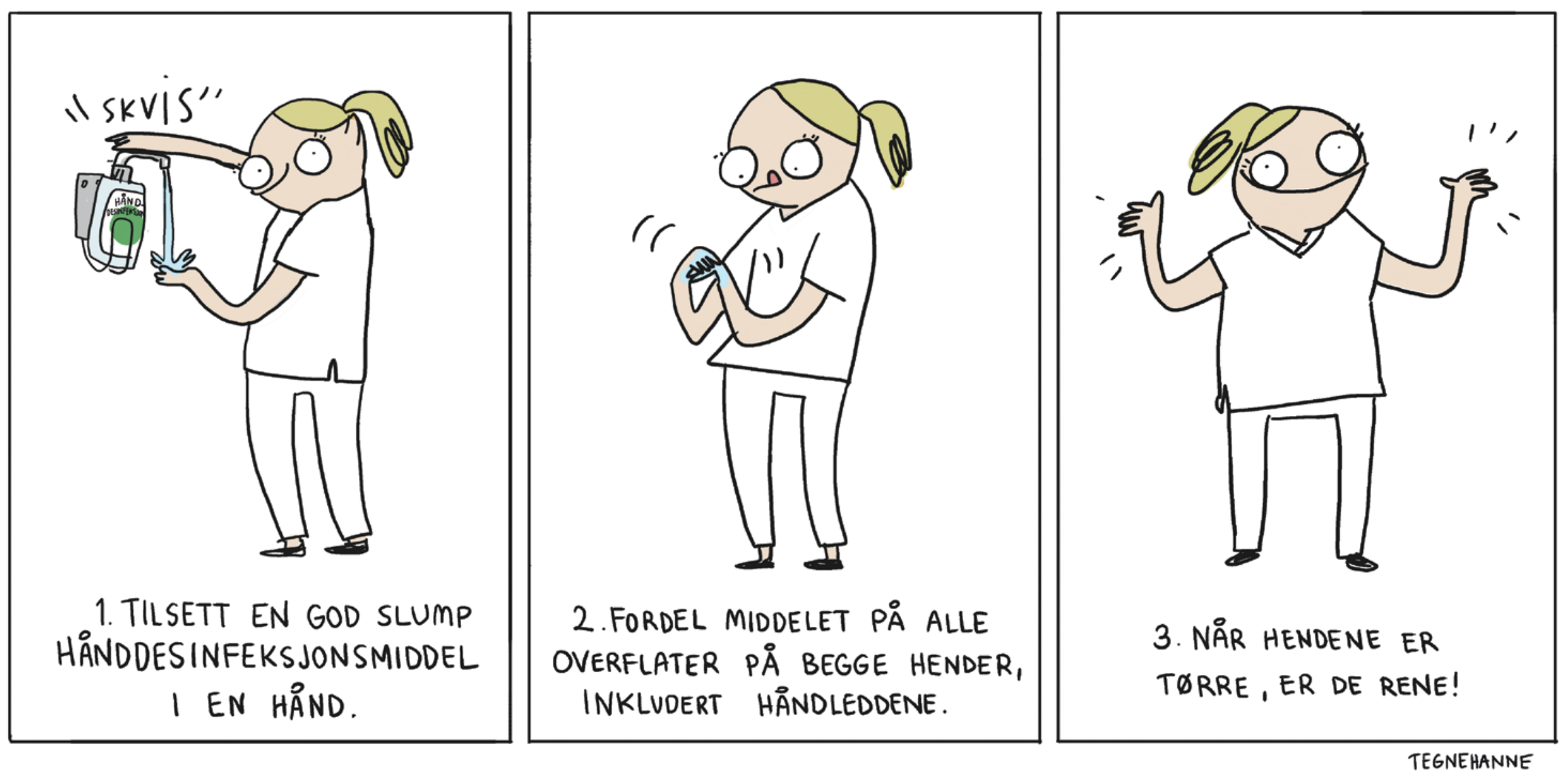 Se anbefalt bruk Hånddesinfeksjon trinn for trinn under: