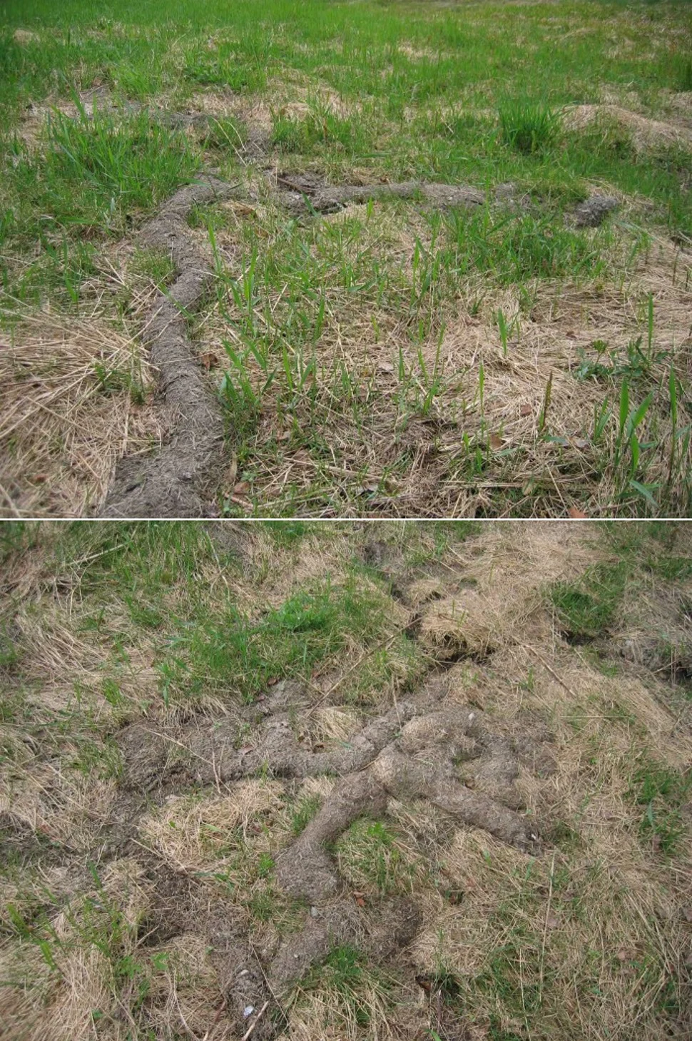 Jordrotter, også kjent som vånd, lager karakteristiske hull i plenen og i andre deler av hagen. Disse hullene er vanligvis sirkulære, med en diameter på 5-8 cm, og er inngangen til et omfattende underjordisk gangsystem. Hullene kan ofte finnes i utkanten av små jordhauger, som er et resultat av jordrotternes graving. Gjennom disse gangene kan jordrottene forårsake betydelige skader på planter og trær, ved å gnage på røtter og forstyrre jordstrukturen. Identifisering av jordrottehull er viktig for å kunne iverksette effektive tiltak mot skadegjøreren før skadene blir for omfattende.