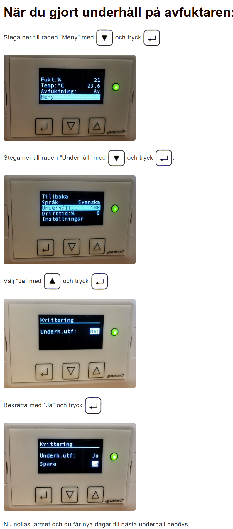 Det betyr at den trenger vedlikehold og at filteret skal skiftes. Når du har byttet filter gå inn på displayet og fjern alarmen. Følgende gjør du: