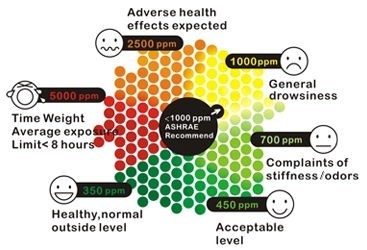 CO2 (karbondioksid) er en fargeløs og luktfri gass som avgis av mennesker, dyr og andre levende organismer. Når ventilasjonen er dårlig, stiger CO2-nivået raskt, noe som kan føre til: