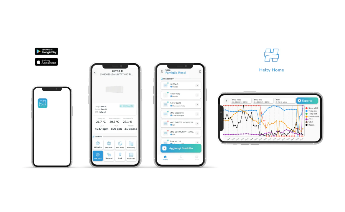 Overvåking av radongass blir enkelt og intuitivt med den nye valgfrie Helty Radon Monitor-sensoren . Sensoren integreres perfekt med de predisponerte VMC-systemene og med Helty Home-appen, noe som muliggjør effektive tiltak for å redusere radonrisikoen.