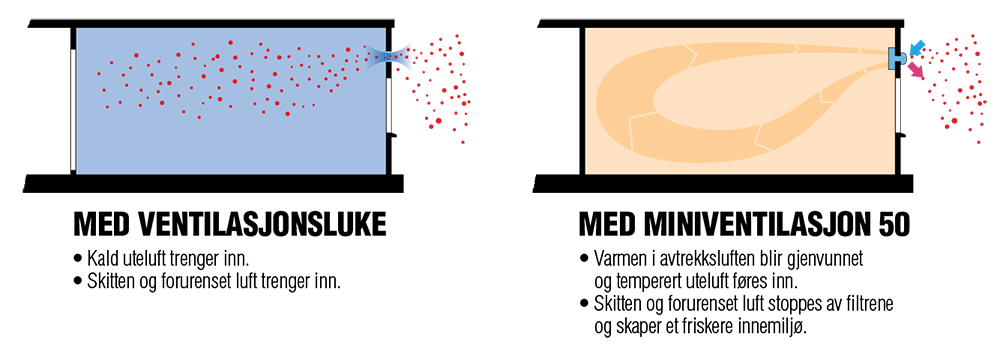 Miniventilasjonen skifter ut forurenset inneluft med frisk uteluft, noe som reduserer fukt, støv og skadelige partikler for et bedre inneklima.