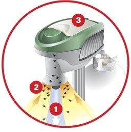 2: Fanger – Når mygg og knott kommer nære nok, suges insektene opp i fangstnettet via en unik og patentert Counter Flow ™ teknologi (blåser ut og suger inn samtidig). I nettet tørker insektene ut og dør innen 24 timer.